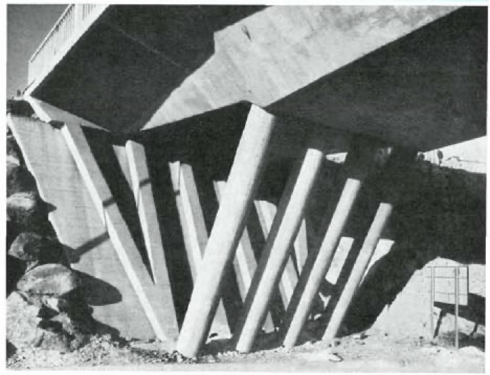En este sentido, los apoyos inclinados de los extremos del puente en forma de V se adaptan al talud del terreno y aligeran la longitud total del puente. Una idea que se repite en casi todos los puentes diseñados por él, también en el que une el pueblo con la zona de Los Bomberos. Hoy en día, entre los refuerzos que se están ejecutando en el Outarelo está el de dotarle de apoyos intermedios de pilares al puente.
